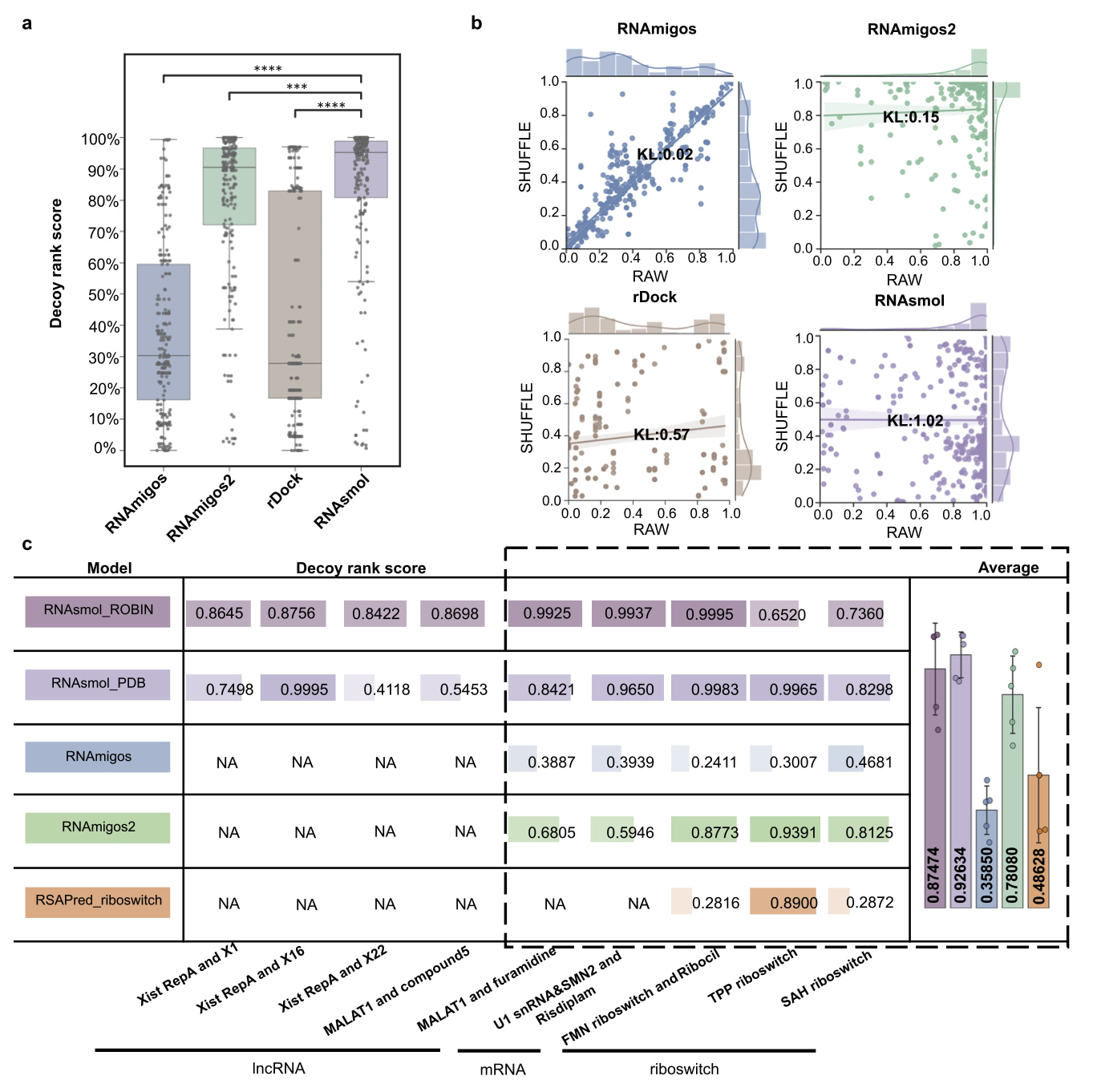 在虚拟筛选的应用中,RNAsmol展现出独特的优势。与传统依赖于结构信息的筛选方法不同,RNAsmol完全基于RNA的序列信息进行预测。因为许多与疾病相关的RNA靶点(如lncRNA)的三维结构数据常常难以获得,RNAsmol能够弥补这一数据缺口实现对这些靶点的预测筛选。实验结果表明,RNAsmol在区分诱饵分子与真实配体时,成功将排序得分提高了约30%。因此,RNAsmol在各类RNA靶向药物筛选中具有广泛的适用性,通过该方法可以更加高效地筛选潜在的药物分子。